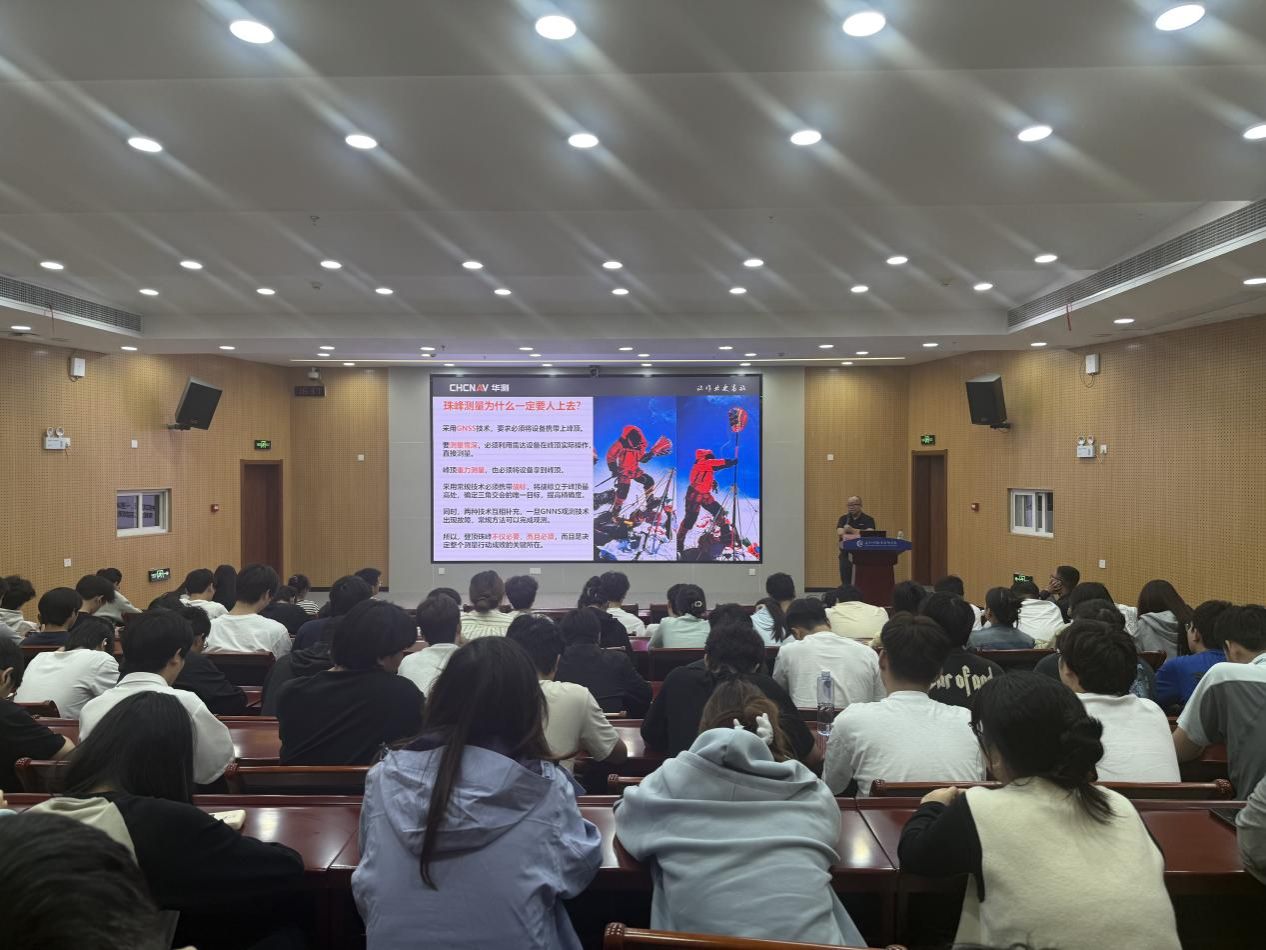 捐赠仪式结束后,胡炜副总裁为学院2024级学生作了题为《我们登顶了——珠峰高程测量》专题讲座。他结合华测导航2020年珠峰高程测量经历,生动讲述国产测绘装备的技术突破与测绘人的攀登精神,激发了师生的专业热情与使命感。