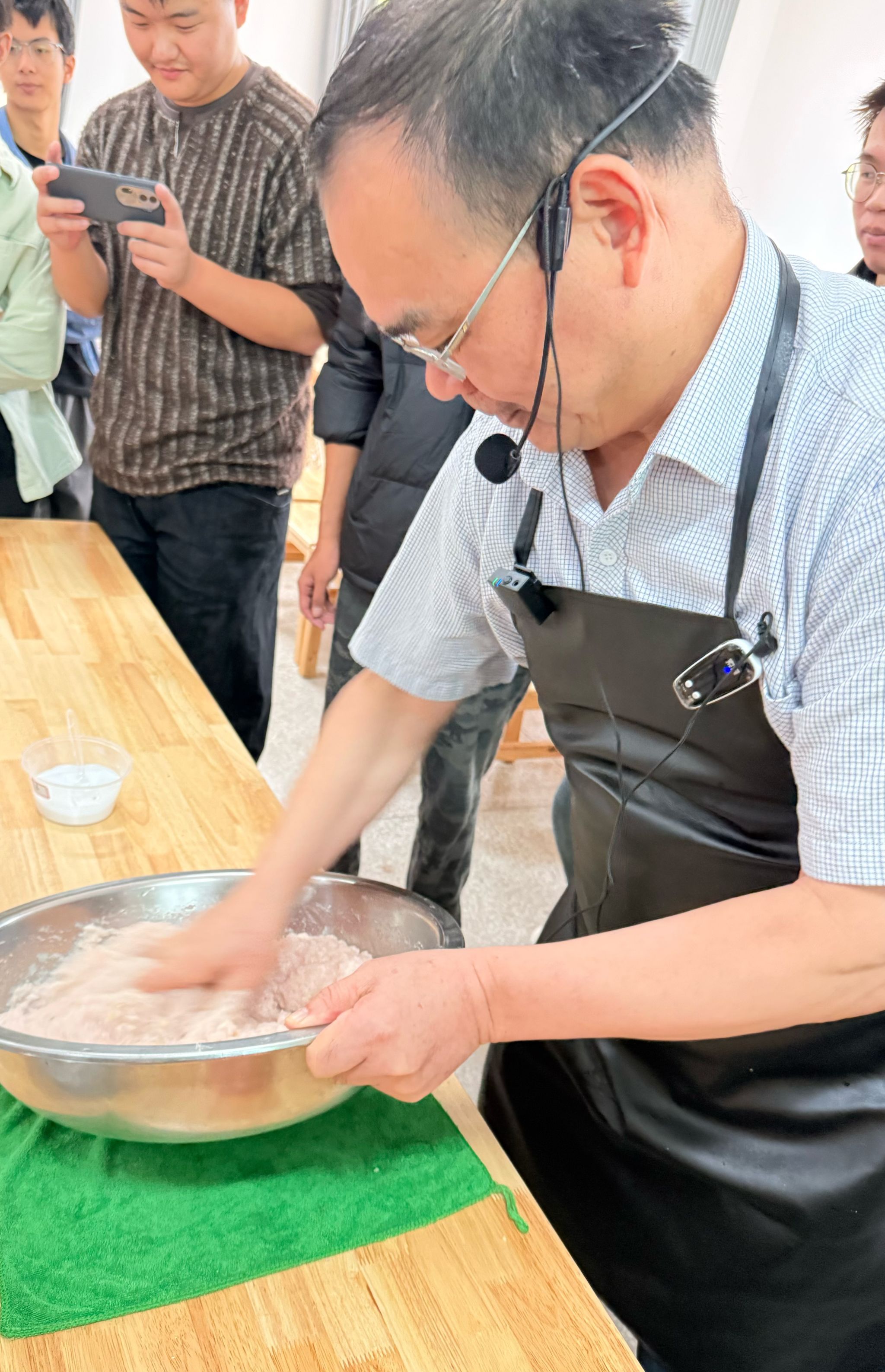 家宴现场,向家文身着围裙,亲手教授同学们制作湖北特色菜肴——手工鱼丸。只见他一边处理鱼肉,一边仔细给同学们讲解这道菜的注意事项和技巧。现场同学们被他精湛的刀工、耐心的教导深深吸引,鱼丸也在“千锤百炼”逐渐成型, 成为餐桌上最受欢迎的菜品。